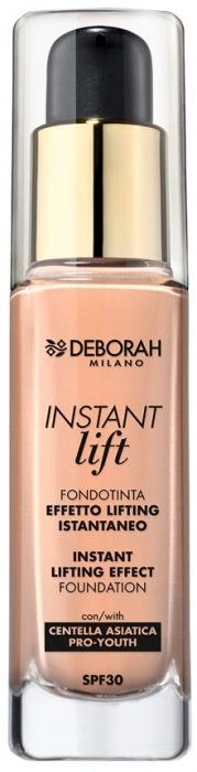 Instant Lift Foundation SPF30 es un maquillaje líquido formulado para despertar la juventud de la piel. Proporciona al instante una apariencia radiante, descansada y menos arrugada a la piel. El efecto lifting es inmediato. Los polvos soft focus reflejan la luz para una apariencia más uniforme, disimulando los pequeños siagnos de la edad. Formulado con un conjunto de vitaminas y Centella, para hidratar la piel y dejarla lisa y suave. La textura ligera se funde con la piel.